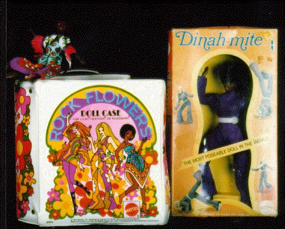 Here are two smaller fashion dolls from the early 70's. On the left, Rosemary Rockflower, 1972, by Mattel. She is seated on her case.... I will have to re-photograph her, as lovely Rosemary is not showing up well! On right, Dinah-mite, 1970, by Mego. She was advertised as the most posable doll in the world. Definitely a Lil' Miss Dollikin competitor! This doll was also sold in a white, long blonde hair version. The Rock Flowers were a set of several different dolls. Each came with her own "groovy" record for you to play! Photo Copyright &cop; 1996 Lisa Sheets. All Rights Reserved |