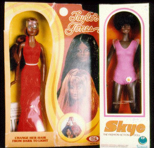 On left, Taylor Jones, MIB, by Ideal, 1976. This doll has a rotating scalp, which allows one to change the doll's hair color from black to auburn. This doll is one of the most beautiful dolls produced in the 1970s. On right is Skye, the fashion/action doll by Kenner, 1975. As Skye is one of my all time favorites, I had to include a picture of her MIB. She was made by Kenner in about 1975, and advertised as "the fashion action doll", along with her freind Dusty. This basic doll was sold in a bathing suit. Because Dusty and Skye's construction is: vinyl legs/arms, and hard plastic torso, I have found it VERY common that dolls are found with limbs "glued" into one place. I have had good luck prying these limbs loose, if you gently and patiently move them back and forth. Photo Copyright &cop; 1996 Lisa Sheets. All Rights Reserved |